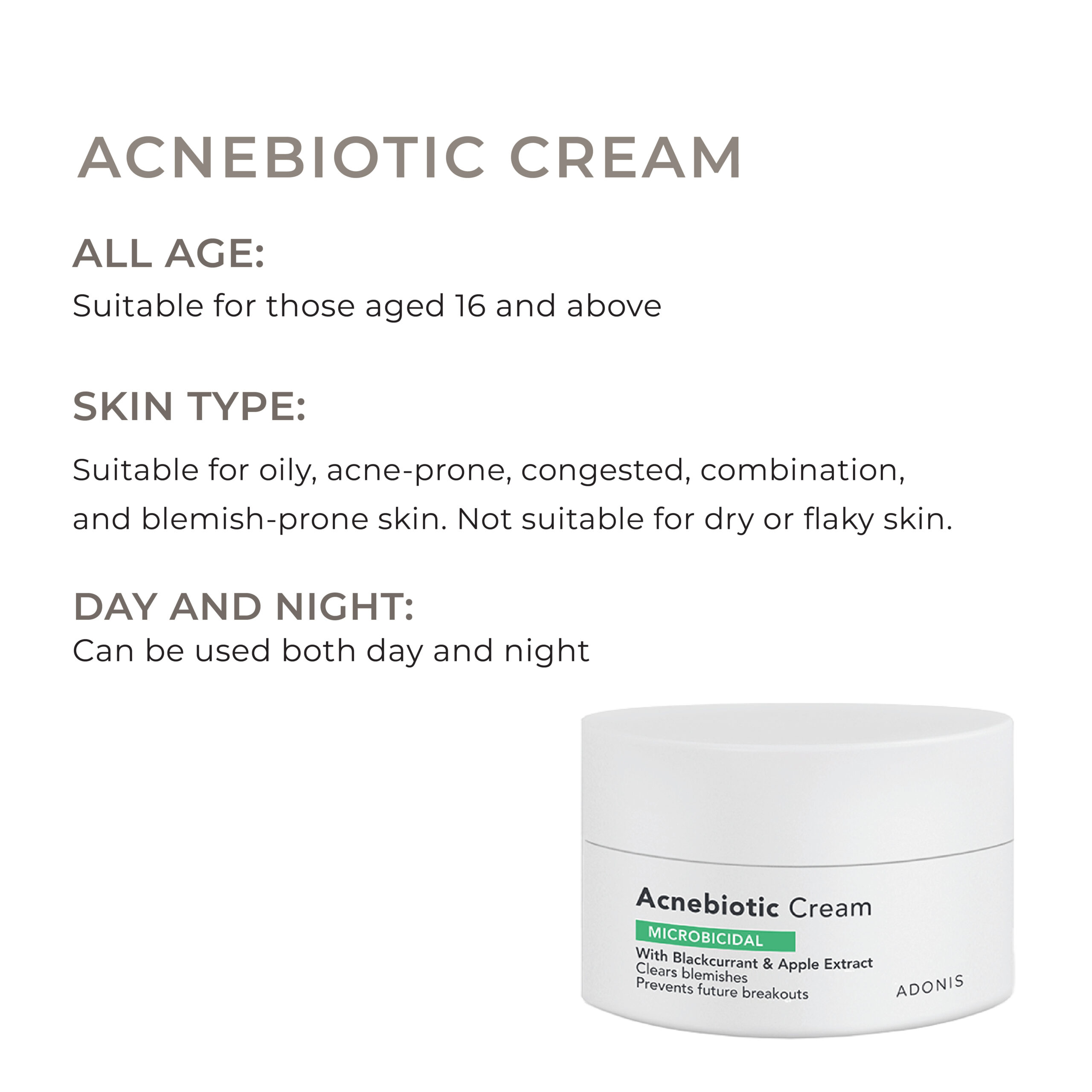 Apply Acnebiotic Cream in the morning and evening. Use the spatula to scoop out the cream, then gently massage it onto your face and neck.