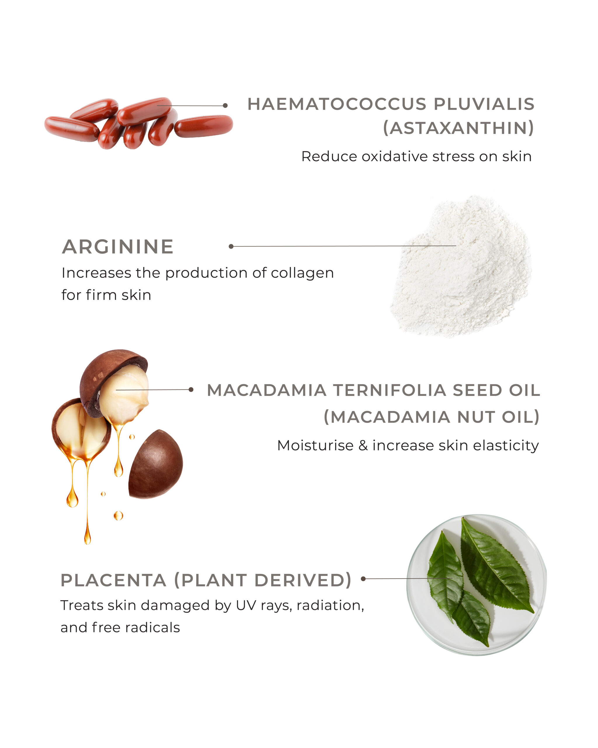 Water, Triethylhexanoin, Butylene Glycol, Squalane, Pentylene Glycol, Behenyl Alcohol, Simmondsia Chinensis Seed Oil, Macadamia Ternifolia Seed Oil(MacadamiaNut Oil), Batyl Alcohol, Stearic Acid, Ethylhexylglycerin, Glyceryl Caprylate, Dimethicone, Caprylic/Capric Triglyceride, Phenoxyethanol, Xanthan Gum, Carbomer, Lecithin, Arginine, Tocopherol, Placental Protein, Glycerin, Fragrance, Trisodium Ascorbyl Palmitate Phosphate, Polygonum Cuspidatum Root Extract(Japanese knotweed), Scutellaria Baicalensis Root Extract(Skullcap root), Centella Asiatica Extract, Haematococcus Pluvialis Extract(Astaxanthin), Polyquaternium-51, Glycerylamidoethyl Methacrylate/Stearyl Methacrylate Copolymer, Rosmarinus Officinalis Leaf Extract, Chamomilla Recutita Flower Extract, Glycyrrhiza Glabra Root Extract(Licorice root), Camellia Sinensis Leaf Extract(Greentea extract), Natto Gum