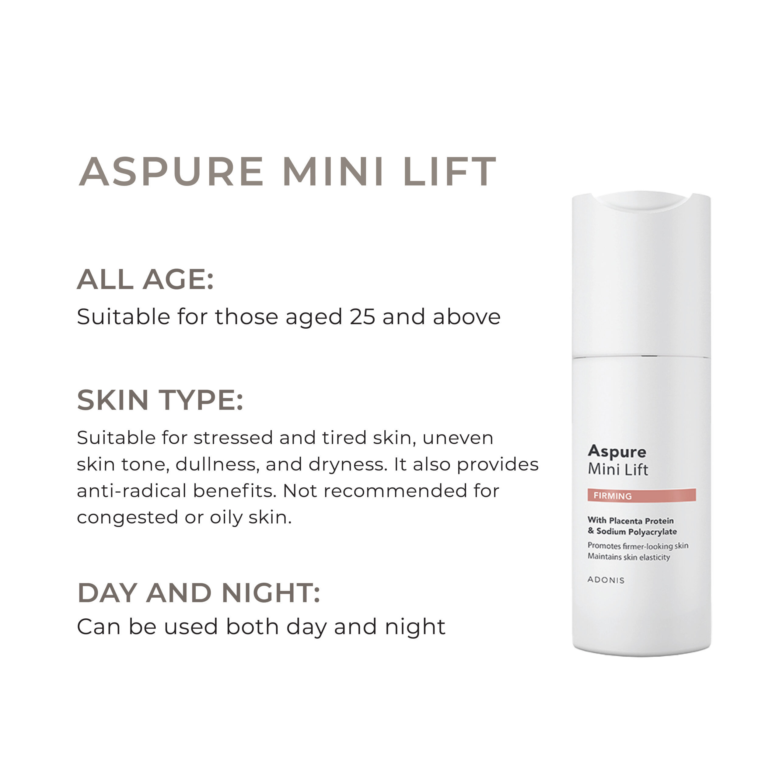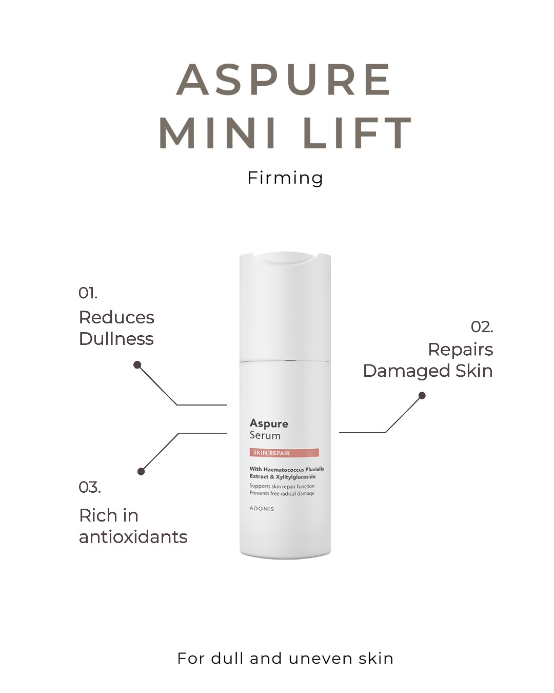 Use in the morning and evening after cleansing. Dispense 1-2 pumps of the concentrate and apply it to targeted areas, such as laugh lines, forehead lines, neck lines, and crown lines, massaging it into the skin. Follow with Adonis Aspure cream for best results.