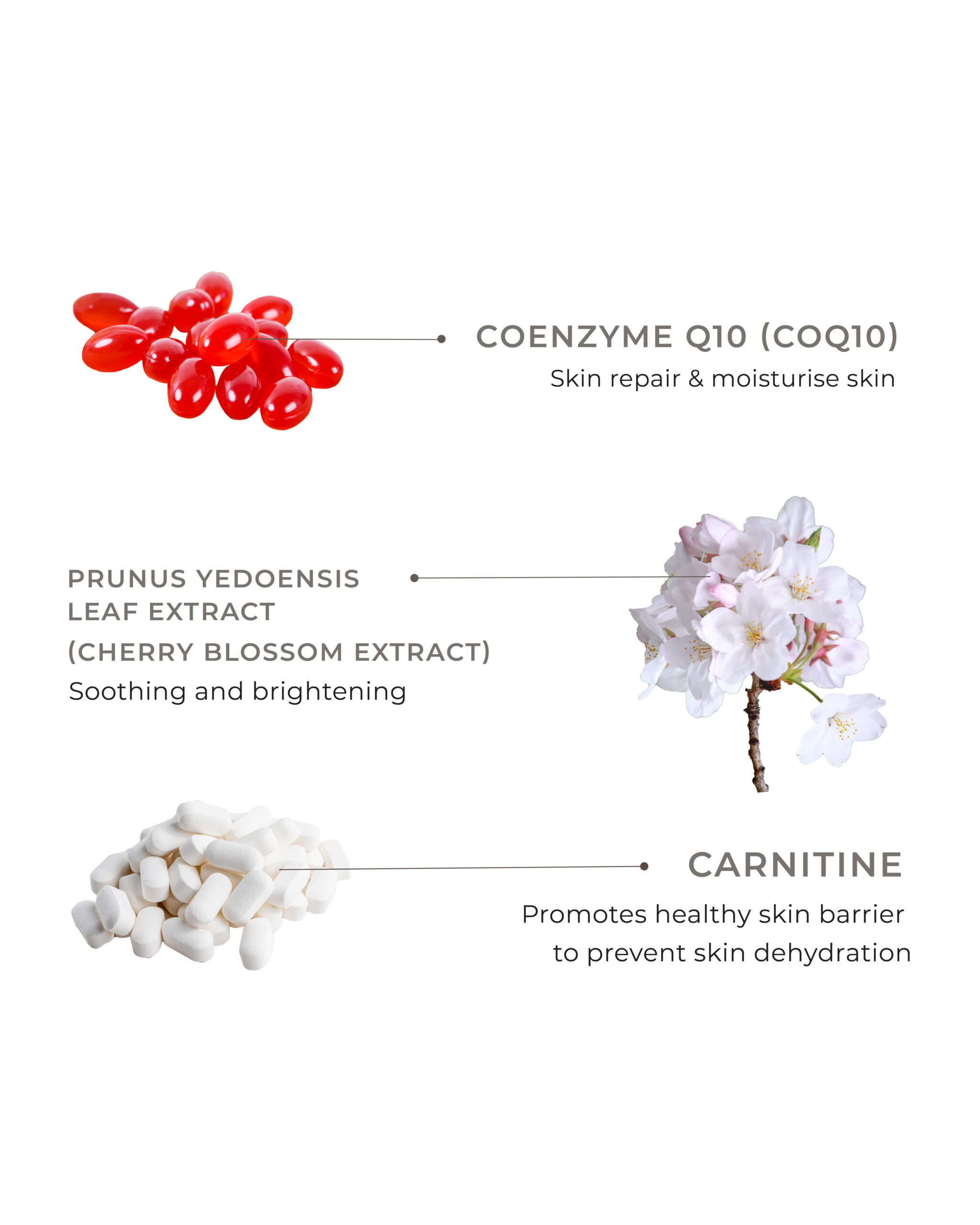 Water, Dimethicone, Dimethicone/ PEG-10/15 Crosspolymer, Dipropylene Glycol, Glycerin, Ethoxydiglycol, Sea Water, Methylparaben, Phenoxyethanol, Propylparaben, Butylparaben, Butylene Glycol, Ethylparaben, Sodium Hyaluronate, Sodium Citrate, Tocopherol, Propylene Glycol, Prunus Yedoensis Leaf Extract Lecithin, Carnitine, Ubiquinone