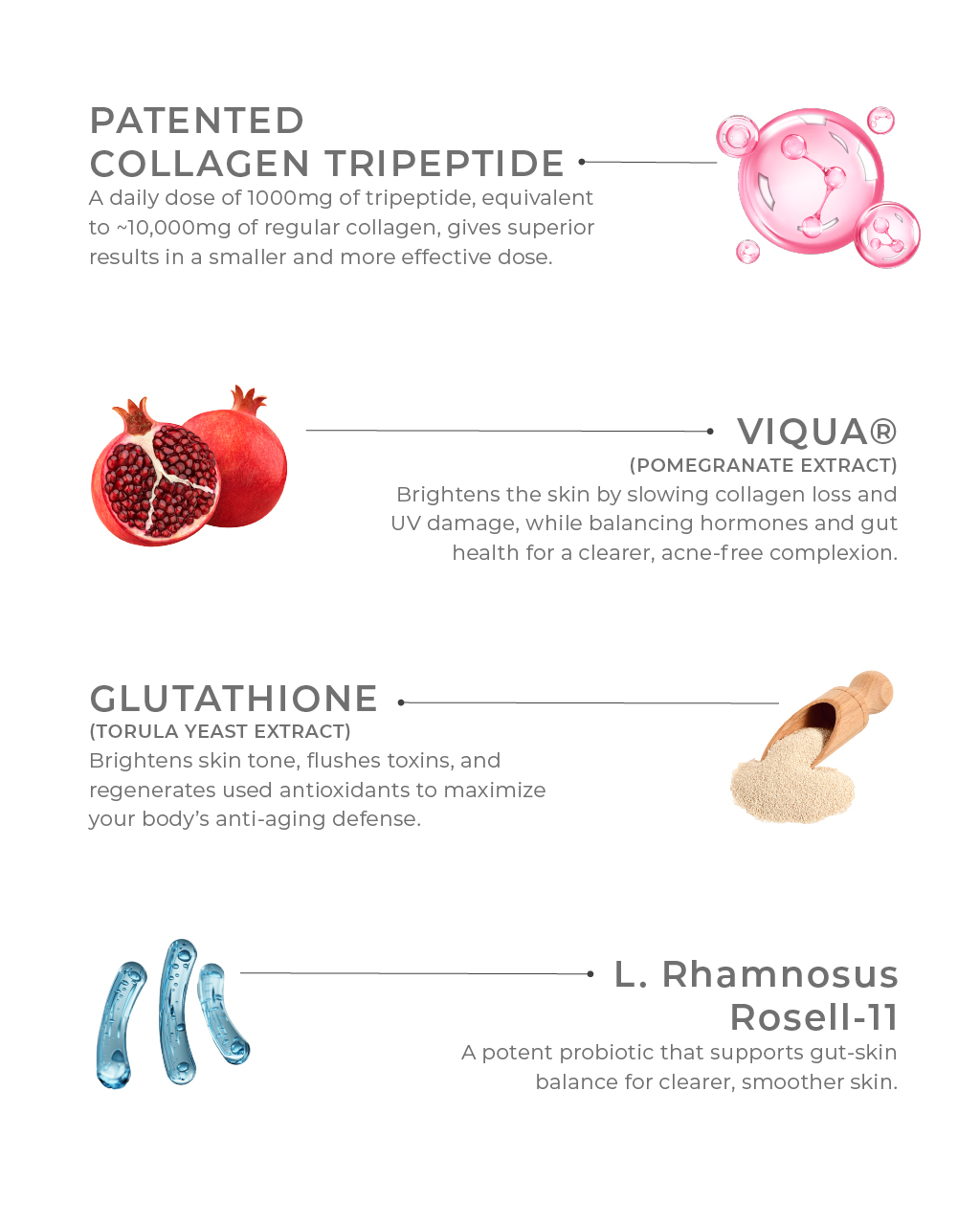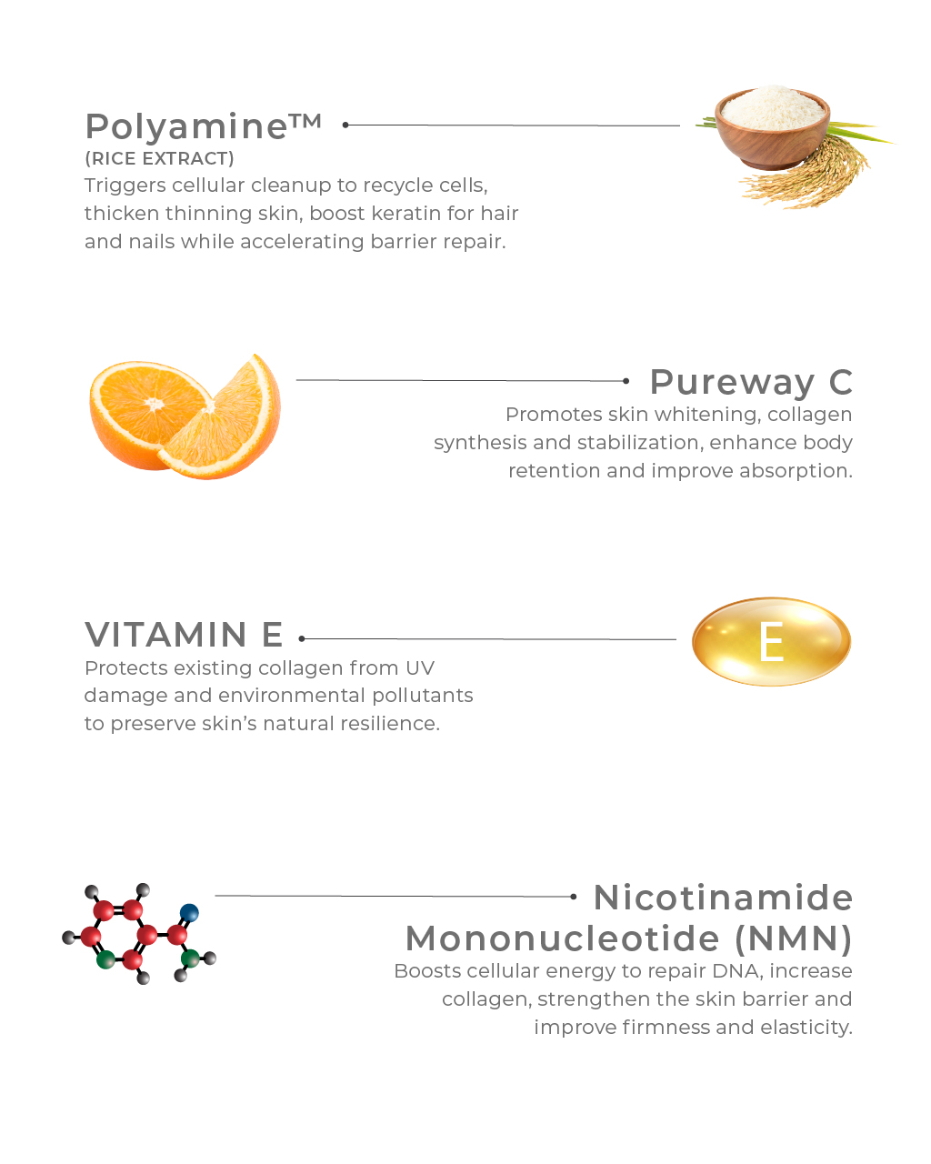 Peach Juice Powder, Erythritol, Isomalt, Collagen Tripeptide (Fish), VIQUAยฎ (Pomegranate Extract), Tricalcium Phosphate, Torula Yeast Extract, Ascorbic Acid, Vitamin E, Polyamineโข (Rice Extract), L. rhamnosus Rosell-11 (Milk), Nicotinamide Mononucleotide (NMN)