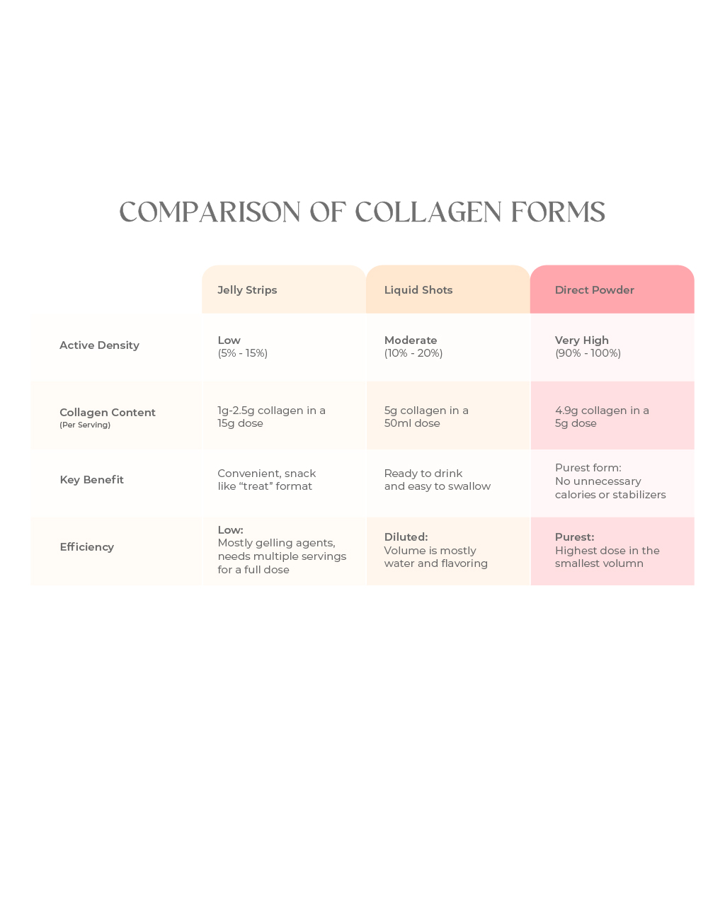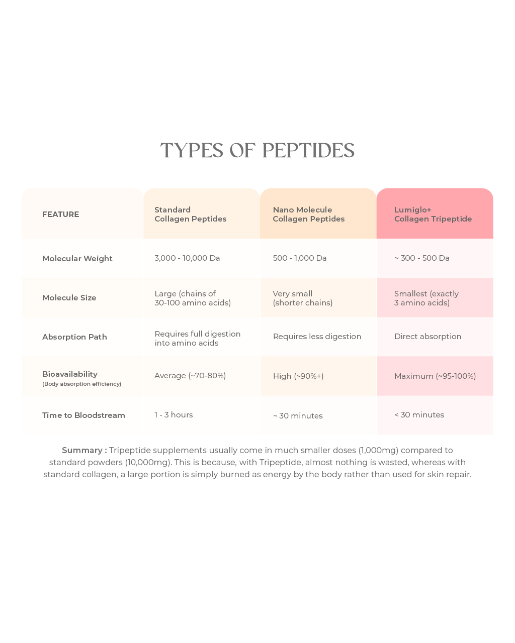 Each sachet contains 500mg korean collagen tripeptide which is equivalent to about 5000mg of regular peptides, easily absorbed, boosts hydration, elasticity, and reduces fine lines.