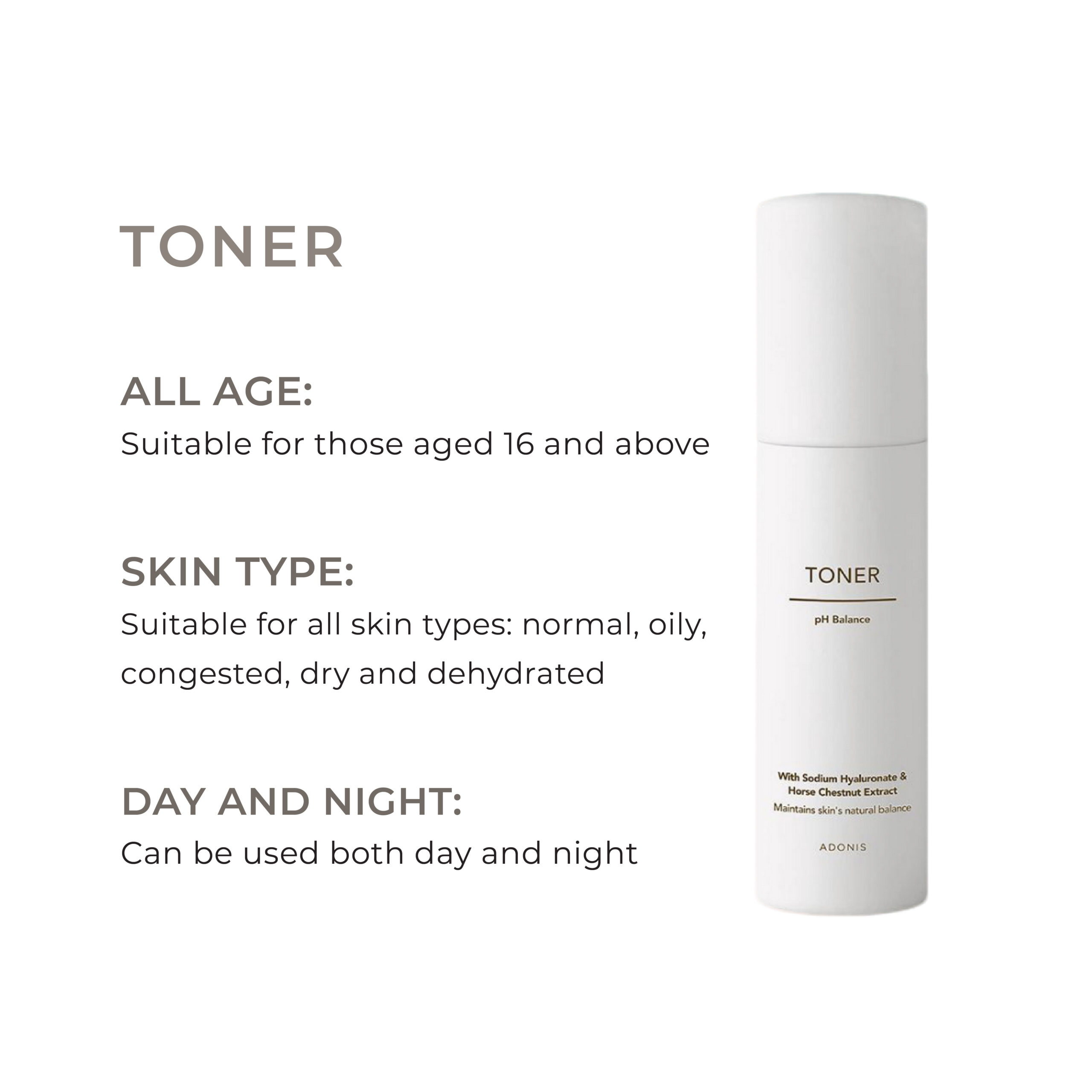 After cleansing, spray directly onto your entire face and neck with your eyes closed. Follow up with your recommended Adonis serum and moisturiser.